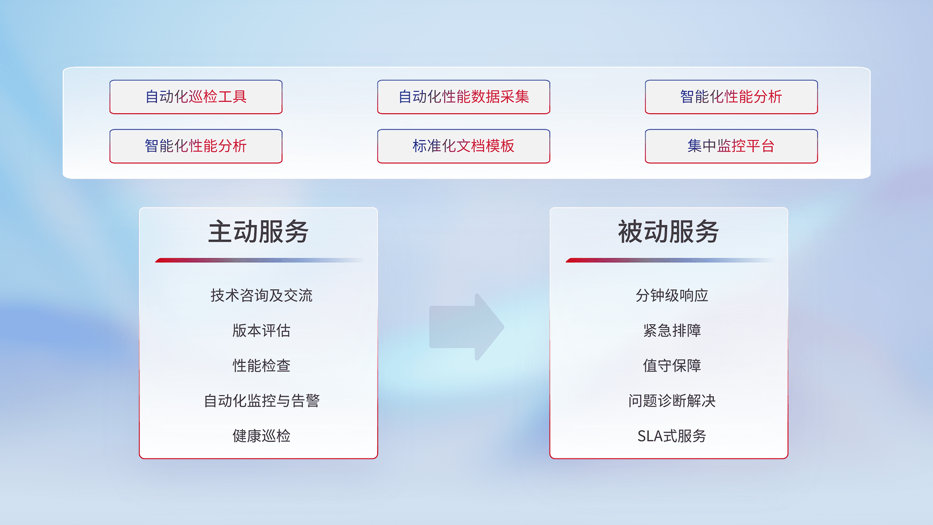 智能化工具和标准化文档,,,,保障服务质量,,,,提供主动服务(包含技术咨询、、版本评估、、性能检查、、、、自动化监控与告警、、、、健康巡检)和被动服务包含(分钟级响应、、、、紧急排障、、值守保障、、问题诊断解决、、、、SLA服务)。。。